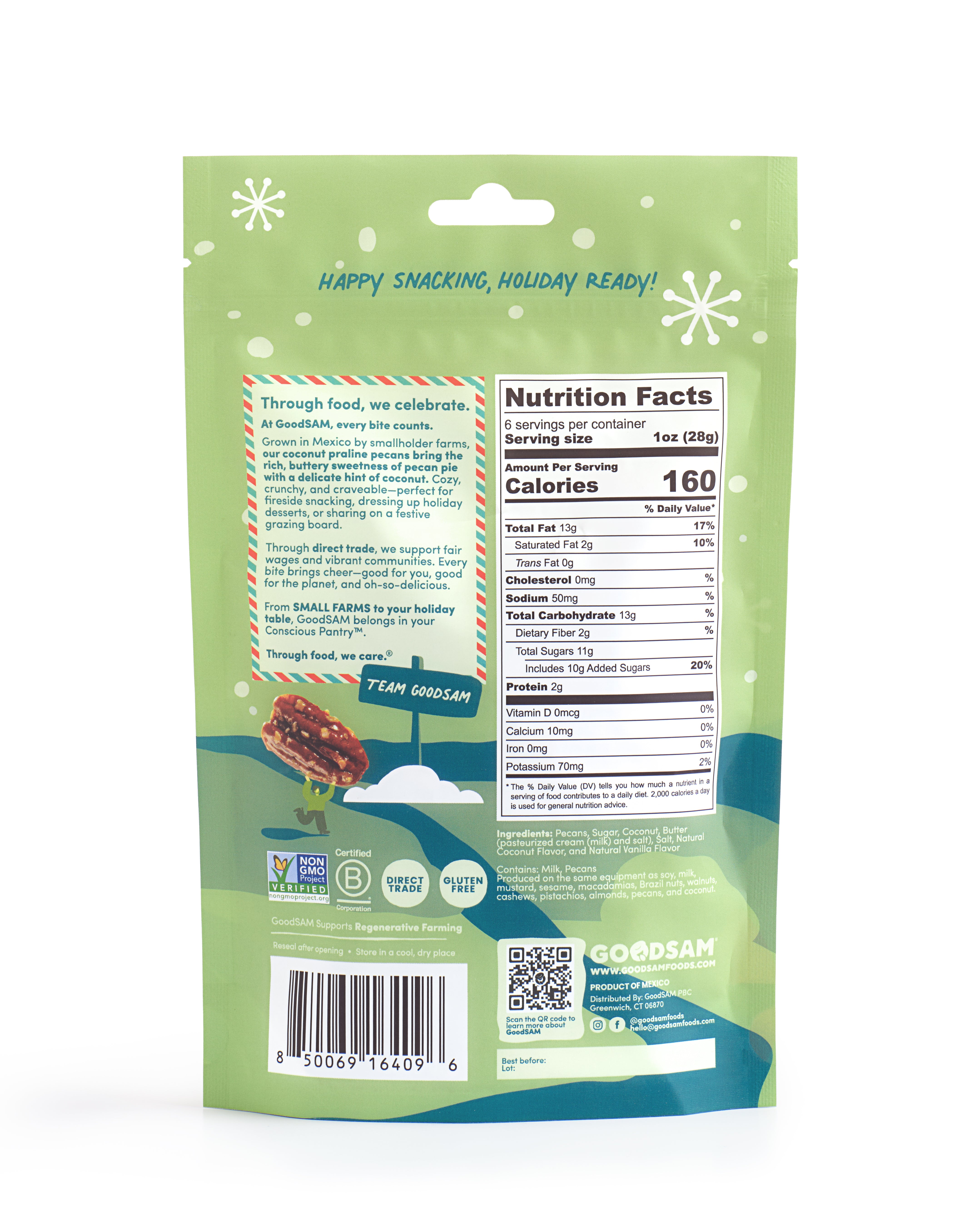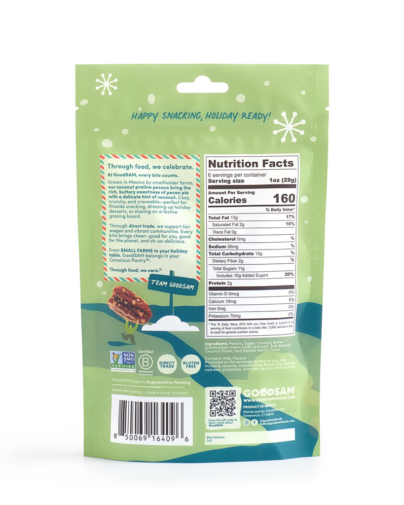 These pecans come from smallholder farms in Mexico, where families have grown and harvested pecans for generations. We coat them in a golden coconut-praline glaze for a rich, Southern-style sweetness that tastes like the best part of a holiday pie… without the baking.