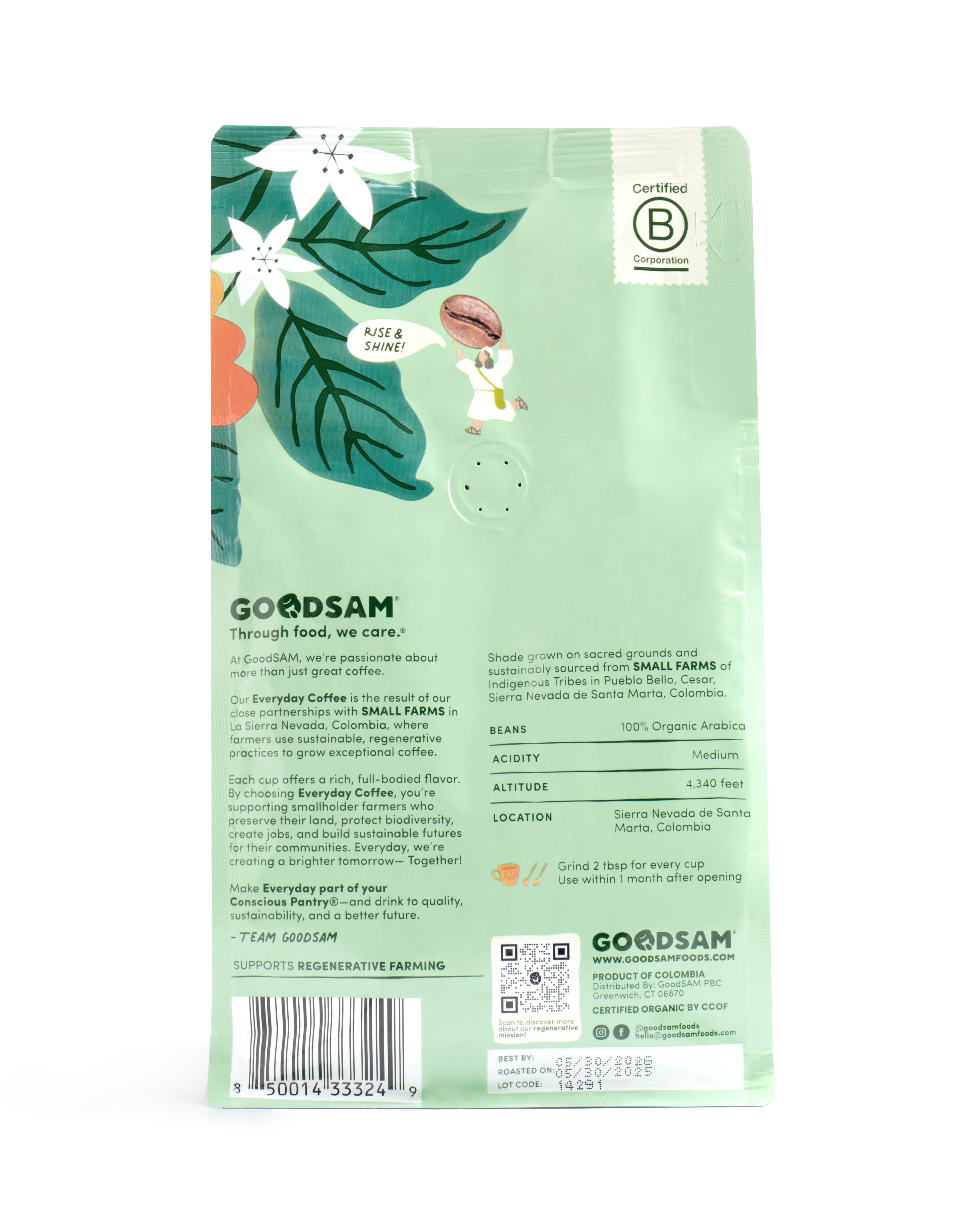 High in Colombia’s Sierra Nevada mountains—at 4,340 feet—our single-origin, organic Arabica coffee is grown in Pueblo Bello, Cesar by smallholder and Indigenous farmers who cultivate biodiverse, shade-grown plots rooted in regenerative traditions. Surrounded by forests, waterfalls, and fruit trees, each bean carries the flavor of the land and the legacy of the families who have stewarded it for generations.